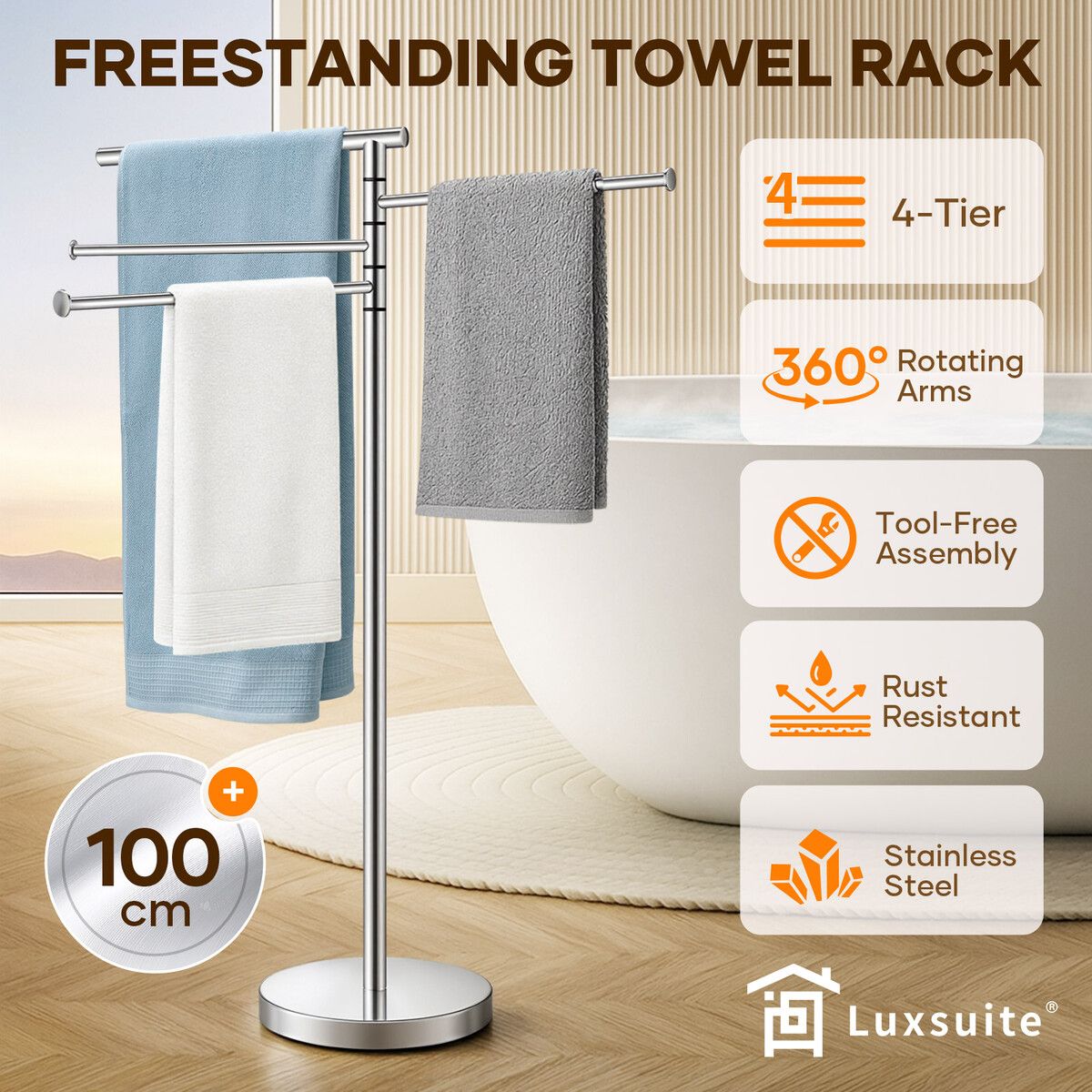 Towel Rail Drying Rack 4 Tier Free Standing Stainless Steel Shower Washcloth Holder Hanger Storage Rotating Hanging Bars for Bathroom Restroom Kitchen